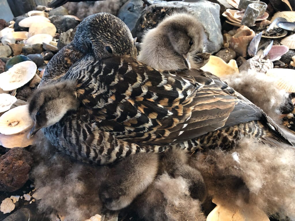 With the ultimately warm eiderdown on her chest, she is not able to expose her body heat to the eggs, therefore the female Eider sheds the eiderdown. This exposes her body warmth to the eggs. During nesting time, the Eider ducks prefer to live and raise their ducklings near the people who take care of them. When it is safe for the Eiders, farmers carefully collect the eiderdown.